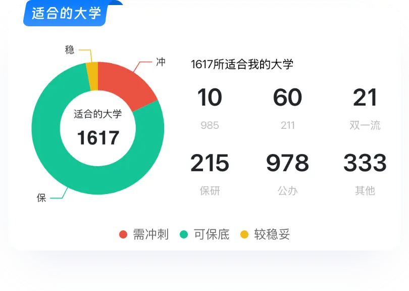 通过全面的数据支持和多维度可视化,帮助用户快速获取各项核心数据。结合精准的匹配推荐,助力考生高效选择最适合的院校与专业,提升填报成功率。